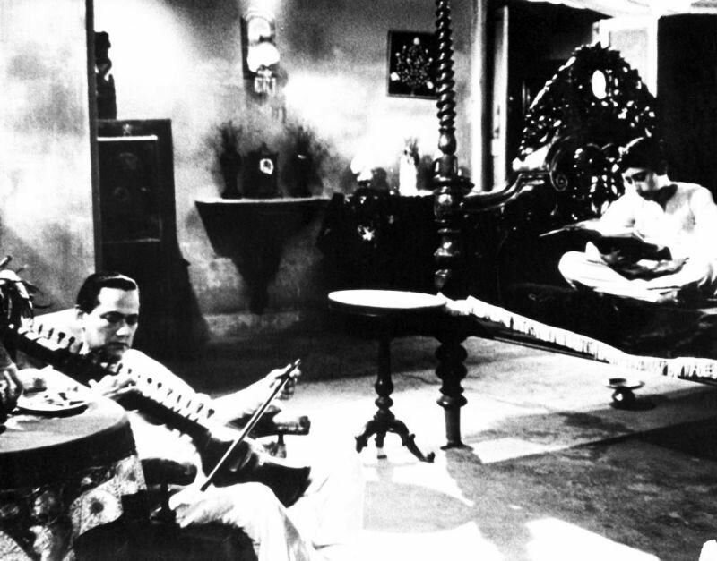 Действие происходит в двадцатые годы прошлого века во дворце в Нимтита, в Бенгалии. Покуривая хуку, на террасе сидит Бишвамбхар Рой, последний из рода бенгальских феодалов. Из соседнего дома доносятся звуки музыки — это сосед-нувориш устраивает праздник по случаю традиционного обряда инициации своего сына.